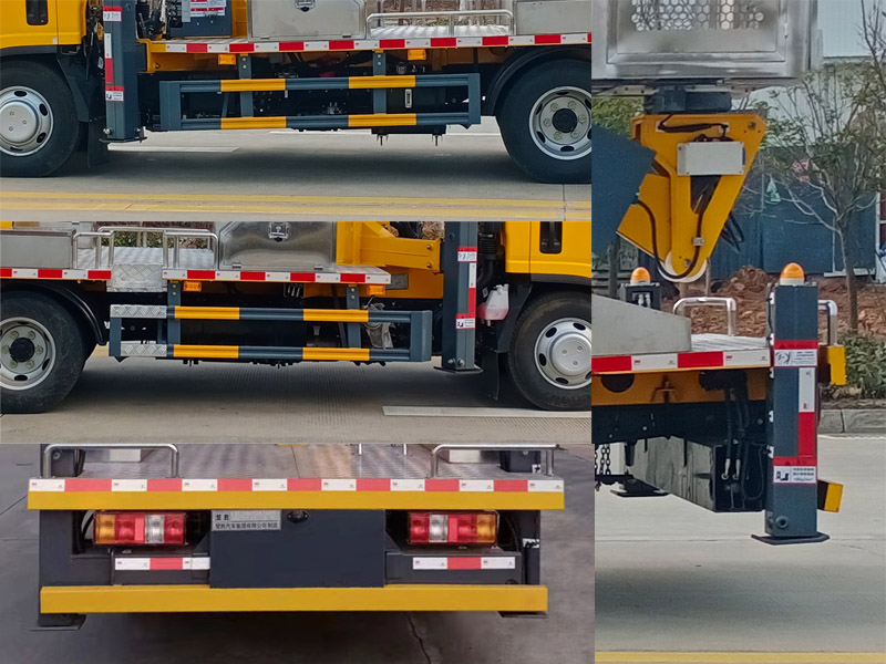 其它:1、該車用途為搶修電力、通訊、路燈等高空作業(yè),主要裝置為升降平臺、作業(yè)臂。2、側(cè)、后防護(hù)材料均為Q235,側(cè)防護(hù)螺栓連接;后防護(hù)焊接,截面尺寸:100×50mm,下邊緣離地高380mm。3、液剎ABS系統(tǒng)型號/生產(chǎn)廠家:3550A500/浙江亞太機(jī)電股份有限公司,APG3550500A/浙江亞太機(jī)電股份有限公司,氣剎ABS系統(tǒng)型號/生產(chǎn)廠家:CM4XL-4S/4M/廣州瑞立科密汽車電子股份有限公司。4、隨底盤:選裝輪輞。選裝前霧燈。選裝前部標(biāo)識。選裝駕駛室側(cè)面標(biāo)識。選裝短桿外后視鏡。選裝長桿外后視鏡。選裝不帶前霧燈。選裝不帶車輪裝飾罩。選裝鋁合金輪輞。選裝前下視鏡。