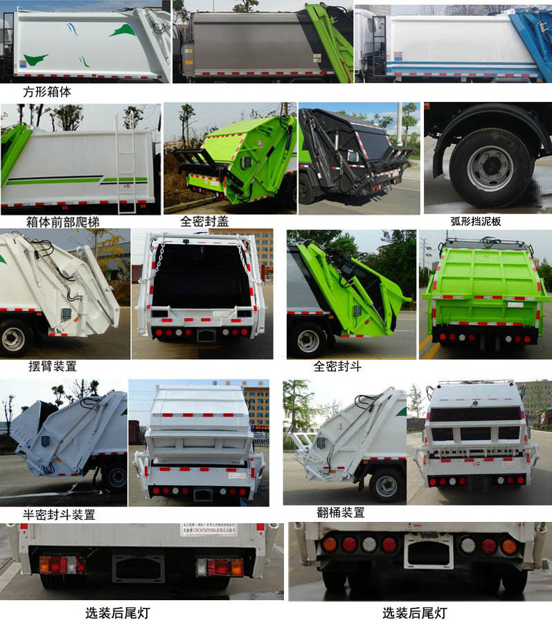 配置  1、該車主要專用裝置由箱體、壓縮系統(tǒng)組成,用于垃圾的收集與清運。該車可選裝方形或弧形箱體,選裝全密封蓋裝置,選裝弧形擋泥板,選裝箱體前部爬梯,選裝后部工作裝置。選裝工作裝置時,外形長(mm)/后伸(mm)/整備質(zhì)量(kg)對應關(guān)系:①無上料裝置: 6465/-/5280;②擺臂裝置: 6625/160/5600;③全密封斗裝置: 6665/200/5600;④翻桶裝置,半密封斗裝置: 6865/400/5600。2、側(cè)防護采用冷彎型鋼/Q235,螺栓連接;后防護由專用裝置替代,下邊緣離地高500mm。3、隨底盤選裝一種僅變化前面板、前格柵、前組合燈具的駕駛室;選裝后視鏡款式;選裝前部標牌“4K ENGING/NJR/NHR/NKR/100P”。ABS型號/生產(chǎn)企業(yè)對應關(guān)系為:APG3550500A/浙江亞太機電股份有限公司,CM4YL/廣州瑞立科密汽車電子股份有限公司;CM4XL-4S/4M/廣州瑞立科密汽車電子股份有限公司;4、發(fā)動機4KH1CN6LB的油耗值為15.9L/100Km。