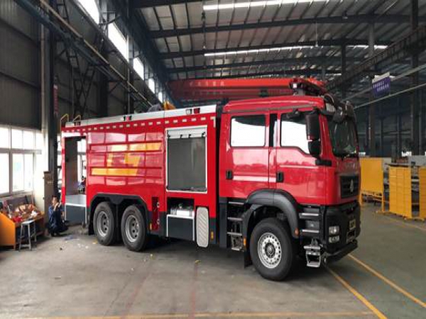 12噸消防車采用中國重汽集團濟南卡車股份有限公司 ZZ5356V524MF5 型二類汽車底盤,原裝雙排駕駛室,乘員2+4人,該車駕乘舒適輕便。上裝采用外露式水罐,整車載液量為水12000kg。器材箱采用高質量鋁合金卷簾門。底盤取力,發動機型號為MC11.44-60,最大功率327kW,通過萬向聯軸器驅動安裝在汽車尾部泵房里的西安華宇CB10/100型低壓消防泵,可在1.0MPa下穩定輸出100L/s的流量;車頂安裝成都威斯特消防器材有限責任公司生產的PSKD8/80型電動遙控消防炮,流量80L/s,對應壓力0.8MPa,最大承壓1.3MPa,射程75m,可360°旋轉,遙控距離同時該車具有比功率大、綜合性能強、操控集中簡便等特點。